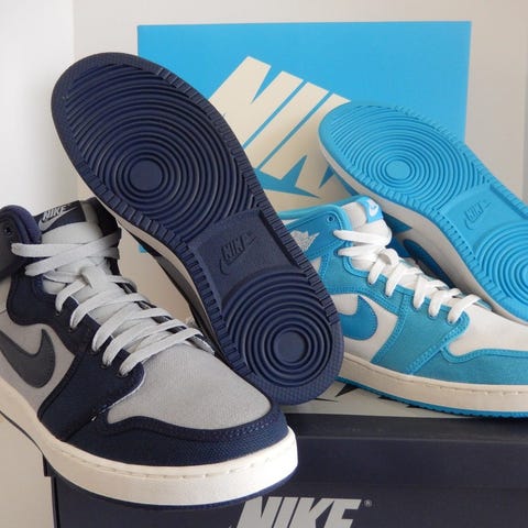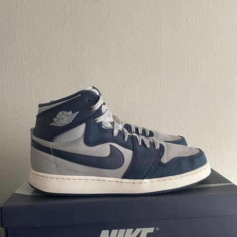 Jeg selger et par Air Jordan 1 AJKO High OG i fargen UNC (Blue/White) fra Rival Pack-utgivelsen. Skoene er i størrelse 46 og er svært lite brukt, med kun fire gangers bruk totalt. De fremstår i meget god stand og har vært lagret tørt for å bevare canvas-materialet. Original eske medfølger. Prisen er 2 300 kroner. Skoene kan hentes i Oslo etter avtale eller sendes for kjøpers regning.