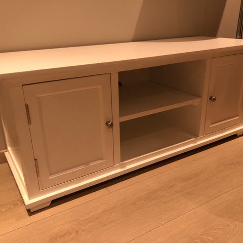 Sort tvbenk fra mobler24 med bein i trefarge. Pent brukt. Kjøpt ny 2024 for 2500kr. God plass til oppbevaring. To dører og en åpen plass med hylle. Hylla kan plasseres lengre ned om ønskelig. Hull på baksiden for å føre kabler gjennom.