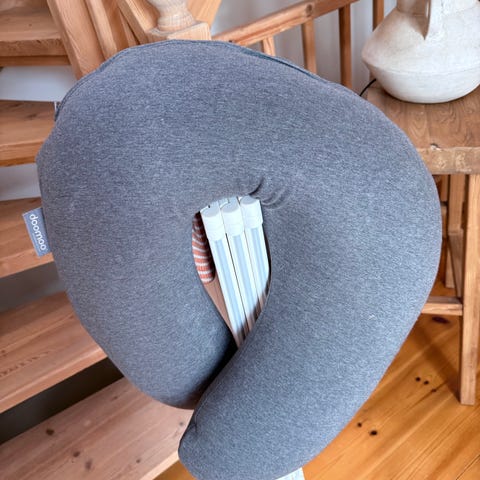Bbhugme ammepute i pink melange. Puten er formbar og kan brukes som støtte ved amming eller flaskemating, samt som avlastning for armer og skuldre. Den kan også brukes som støttepute for baby eller som komfortpute for voksen i stol eller sofa. Dustbag medfølges.