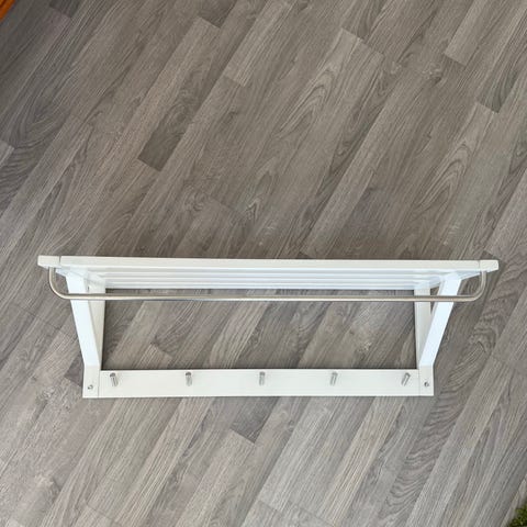 Helt ny hattehylle i orginal forpakning. Confetti hatrack. Hvit i tre. Kjøpt på Fagmøbler. Vi kan desverre ikke benytte den da den ble for bred der den var tiltenkt. Kjøpt på 40 %. Finner ikke bilder av rett hylle på nett hos fagmøbler, men fant en som ligner hos Møbelringen.