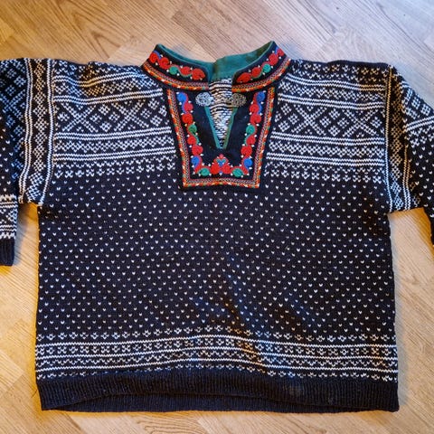 Klassisk hjemmestrikket kofte i ull med tradisjonelt Setesdal-/lusemønster i sort og natur str M/L.