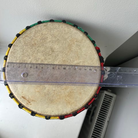 Trommen er i god stand, skinnet er helt og fint, og den har en klar og fin klang for størrelsen.