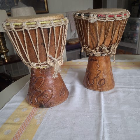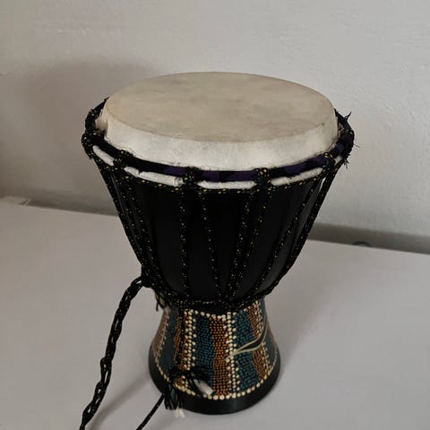 Selger en dekorativ og sjarmerende liten djembe-tromme. Trommen er håndlaget i tre med ekte skinn og tradisjonelt tausystem for stemming.