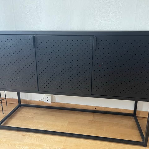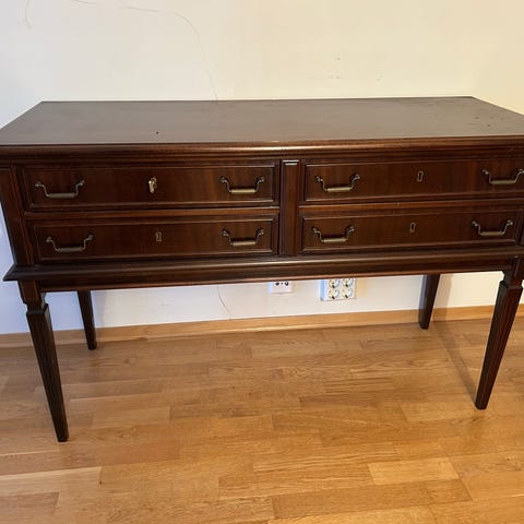 Skjenk - spisestue. Lagringsplass foran på hver side av skuffene (4 stk) samt lagringsplass på hjørnene. (1 lås til lagring foran har mistet festet, så en liten egenrep. nødvendig - lås følger med). Nøkler til låsbare skap og skuffer. Må hentes i Oslo.