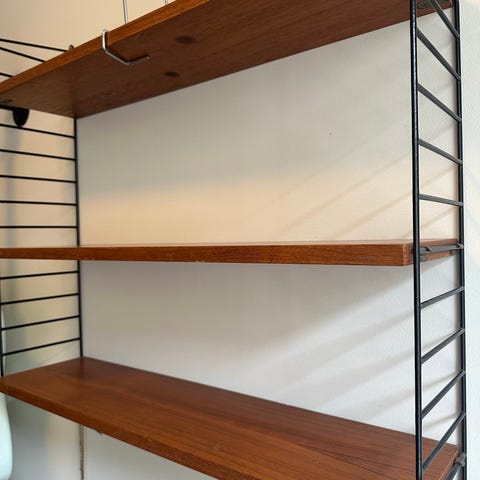 Nett hylle med 2 hylleblader og en skrivebordsplate! Hyller 80cm i bredde og skrivedel er 40cm dyp. Veggfester er 99 cm lange. Satt i produksjon igjen av DK3 men ikke i teak og koster da over 18000,- . Selger denne vakkre og plassbesparende retroperlen for 2600,- Kan sendes!!