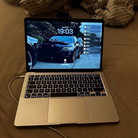 Selger en MacBook Air M1 2020 i den stilige fargen Rose Gold.
