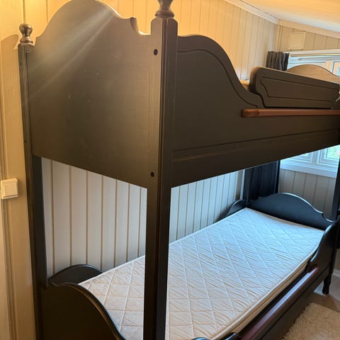 Selger vår fineste og elskede trehytteseng fordi dette har ikke plass i nye rommene til jenter fordi skråtak. Selges uten madrasser. Har plass til to madrasser 90x200.