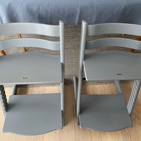 Pent brukt 2 x Babysett med brett til Stokke tripp trapp stol i farge storm Grey selges for 700 kr pr sett
