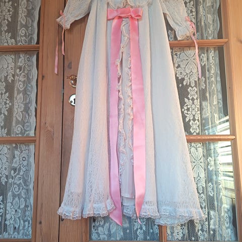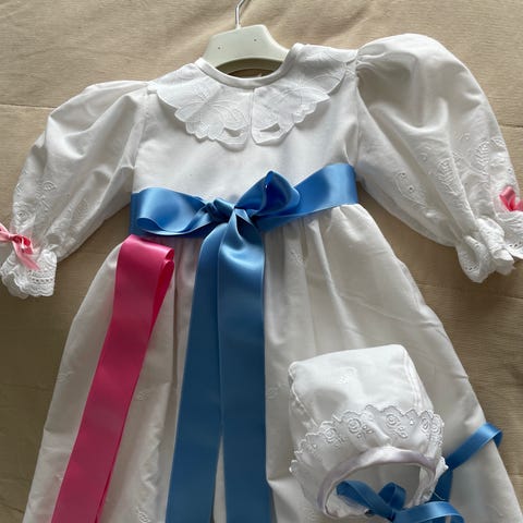 Selger en pen brukt dåpskjole sydd i lekker blonde stoff og på kanten med søte ringer. Kjolen er foret og kan benyttes med blå eller rosa sløyfer som følger med. 2 ulike dåpsluer følger også med. Luen til gutt er i silke stoff, og luen jente har bonde rundt kanten. Kjolen har lengde 98 cm.og har borrelås bak kjolen i hele lett å ta på seg,