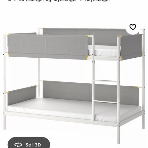 Selger vår ikea køyeseng som har stått på hytta i 10 år. Pent brukt, og nå delt opp i 5 deler for enklere frakt og sammenskruing. Det er 200 x 90cm madrasser som passer i denne (medfølger ikke).