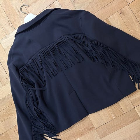 H&M blazer for dame i størrelse M. Blazeren er svart og laget i polyester. Modellen har frynser og små metallnagler som dekor foran og bak. Åpen front uten synlig lukking. Passer til bruk over topp, skjorte eller kjole ved ulike anledninger.