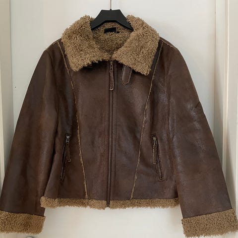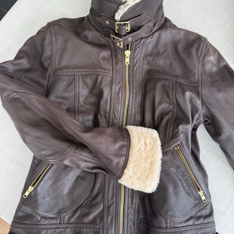 Dette er en kort jakke i ekte skin fra den italiensk merke Sandro Ferrone. Glidelås foran og en teddyfor. Mange smarte detaljer.