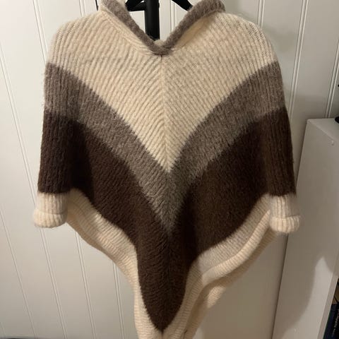 Ullponcho for dame i størrelse M. Ponchoen er flerfarget med lys hovedfarge og mørke detaljer langs åpning og kant. Den har glidelåslukking foran og dekorative frynser nederst. Egnet som ytterplagg eller som et ekstra lag over annet tøy på kjølige dager.