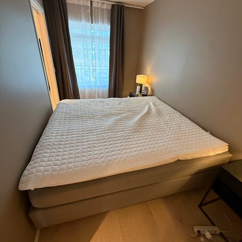 Sengen består av regulerbar bunn, Tempur-madrass (Aloe Vera) og Tempur-overmadrass (Sultan tafjord fra Ikea).