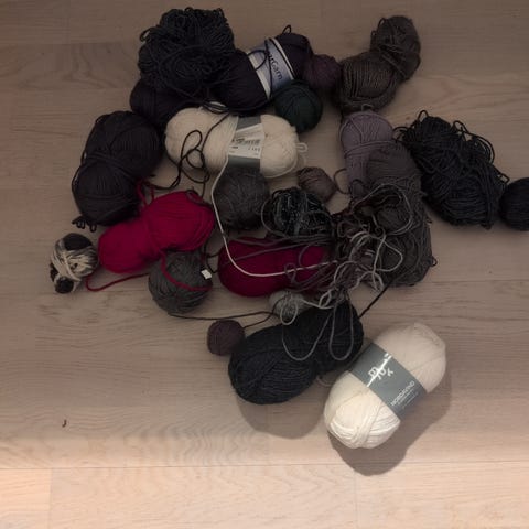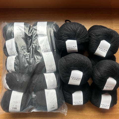 garnpakke i flere nøster i svart og grå farge. Garnet ser ut til å være av middels tykkelse, egnet til strikking eller hekling av plagg og tilbehør som luer, votter, skjerf eller småprosjekter. Nøstene er i ulike størrelser og er veid enkeltvis på kjøkkenvekt, som vist på bildene, for å gi et inntrykk av mengden garn som følger med i pakken.
