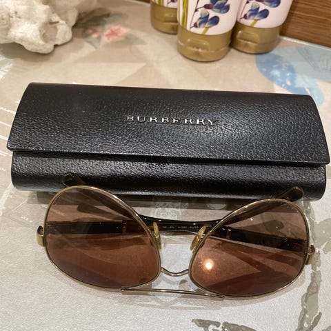 Burberry vintage solbriller unisex med rektangulær svart innfatning. Solbrillene har mørke glass og klassisk Burberry-etui med rutemønster. Passer til både kvinner og menn.