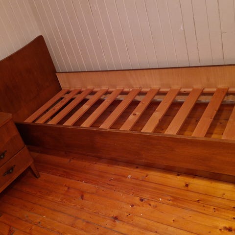 Gedigen seng i eik. Madrass-mål 2x2 m.