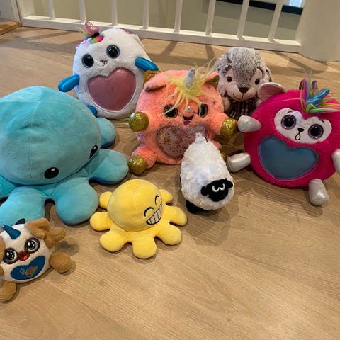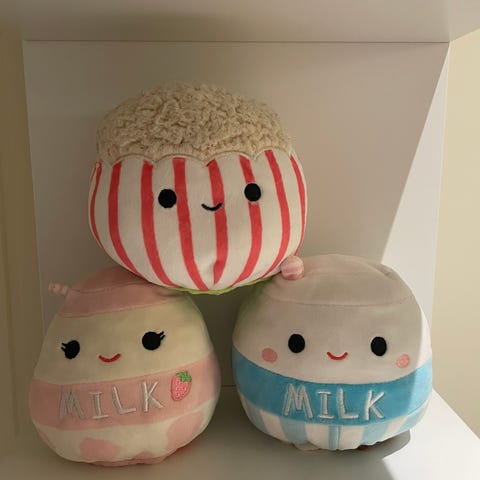 En av bamsene er en Squishmallows Flip-A-Mallows, som fortsatt har lappen på. To av bamsene kan vendes for å få et annet uttrykk.