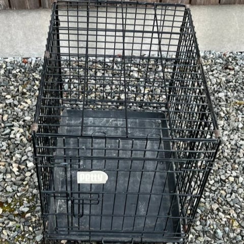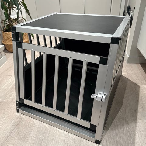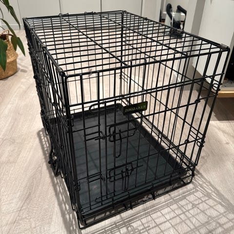 Sammenleggbar hundebur i svart metall. Buret har gitterkonstruksjon med bærehåndtak og uttakbar bunnplate i plast/metall for enklere rengjøring. Egner seg til bruk innendørs eller i bil for transport eller som hvileplass for hund. Buret kan foldes flatt for enkel lagring når det ikke er i bruk.