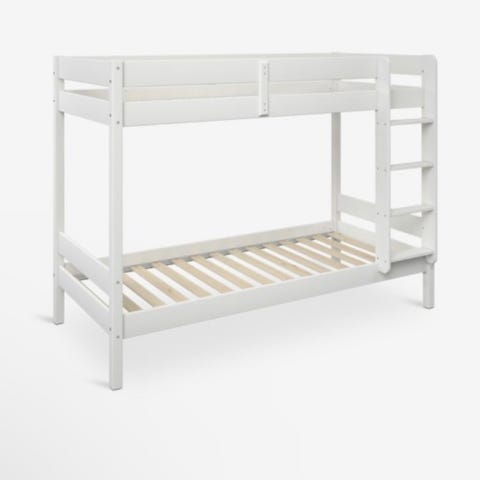 Hoppekids køyeseng i hvit utførelse. Sengen har integrert stige på siden og sengehest øverst for økt sikkerhet. Leveres med lamellbunner i tre. Målene på sengen er omtrent 206 cm i lengde, 98 cm i dybde og 140 cm i høyde, med angitte høyder for liggeflate og sengehest som vist på bildet. Egnet som plassbesparende sengeløsning til barnerom eller ungdomsrom.