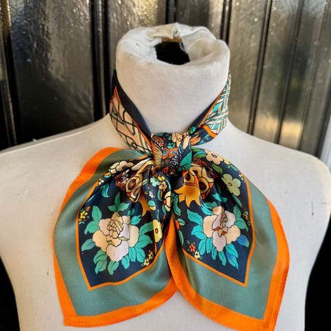 Ordentlig røde farger. Flott silkeskjerf i den fineste silke kvaliteten. Skjerfet er mykt og behagelig å ha på. Veldig enkel å dandere på ulike måter da silken er så fin. Størrelse 53x53cm. Helt som nytt. Blir litt ulike inntrykk etter hvilke ende man viser frem. Kan gjerne sende som brev med posten for 46.-