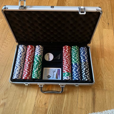 Pokerkoffert med sjetonger og kort. Sett i aluminiumskoffert med flere farger sjetonger (svart, blå, grønn, rød og hvit), to kortstokker, dealer-knapp og terninger. Egnet til hjemmepoker og andre kortspill der man bruker sjetonger som innsats- eller poengsystem.