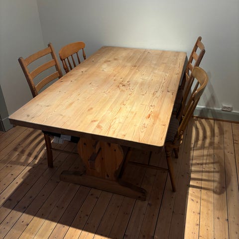 Spisegruppe med hjørnebenk, spisebord og stoler i furu. Settet består av en vinkelbenk med rygg og utskårne detaljer, et ovalt bord med søyleunderstell og to stoler med ryggstøtte. Alle deler er i heltre furu. Passer som spiseplass på kjøkken eller i spisestue, spesielt egnet til plassering i hjørne for å utnytte plassen godt.