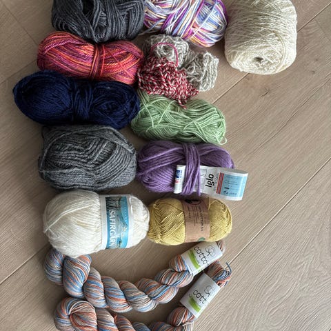 Håndfarget garn i merinoull i lilla toner fra Unikt garn sammen med lilla silk mohair fra untold. Skulle egentlig bli en Eva cardigan fra Petite knit, altså strikkefasthet 20m/30. Til sammen er det 584 gram garn.