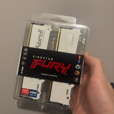 Helt nye Kingston Fury DDR5 5200 16GB(2x8GB ram selges. Kun tatt ut av esken og satt i PCen en gang så tatt ut av PCen og i boksen igjen. Selges da jeg trenger DDR5 5200 2x16 GB istedenfor