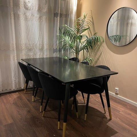 Selger spisebord og inkludert 6 stoler fra bohus Trondheim spisebord 180x90 lakkert eikefiner svart med eikeben. Selger pga flytting