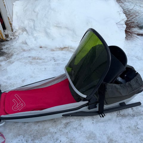 Lite brukt Fjellpulk for barn selges. Vindskjerm, sete, liggeunderlag i bunnen og veltebøyler. Uten sele og drag.