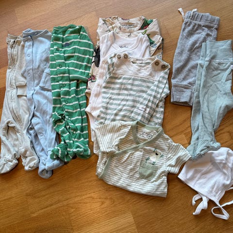 Nøytral klespakke i størrelse 56. Pent brukt til nyfødt.