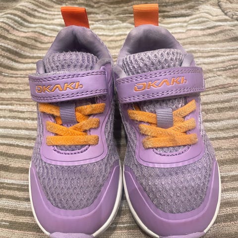 Okaki joggesko for jente i størrelse 31. Skoene har overlær i lilla syntetisk materiale med pustende meshfelter og oransje innside. Modellen har kombinasjon av lisser og borrelås over vristen for enkel tilpasning. Sålen er kraftig med mønster for godt grep, i hvitt med kontrastdetaljer. Egnet som hverdagssko og til lett aktivitet for barn.