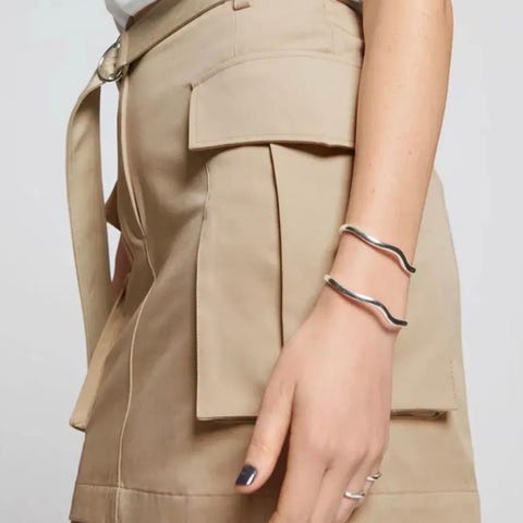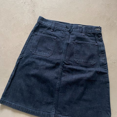 Dongeriskjørt i størrelse 36/S, norsk design ved damene i SoHee (ikke One and Other/AI). Skjørtet er laget i grå denim og har A-fasong. Foran er det skrålommer med klaff og knapper, samt gylf med glidelås og knapp i livet. Bak har skjørtet påsydde lommer med knapp. Belteløkker i linningen gjør det mulig å bruke belte. Pent brukt en håndfull ganger.