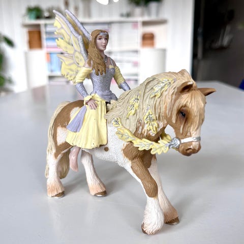 Fine Schleich hester (en fjording) med rytter og div utstyr