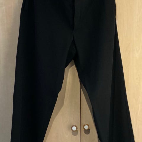 Zara bukse for herre i størrelse S/M. Buksen er svart og laget i polyester. Klassisk modell med beltehemper og lommer, egnet til hverdagsbruk eller mer formelle anledninger avhengig av styling.