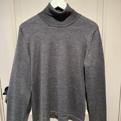 Grå turtleneck fra DBT. Som ny, kun prøvd på. Gullknapper nederst på ermene. Strl. XXL, men liten i strl.
