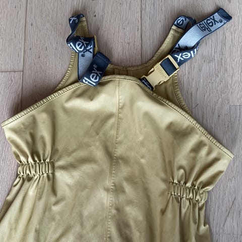 Reflex regntøysett for barn i størrelse 104, unisex. Sett består av regnjakke med avtakbar hette og glidelås foran med klaff, samt regnbukse med seler. Fargekombinasjon i blå og mørk blå. påsydde refleksdetaljer på jakke og bukse. Bukse med strikk nederst i bena og fotstrikker for bedre passform. Egnet som yttertøy i vått vær for barn i aktuell størrelse.