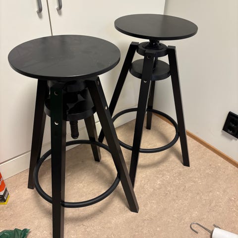 Stilrene og solide barstoler i sort tre med rundt sete og fire stabile ben. Stolene har praktisk fotring og skrumekanisme som gjør det enkelt å justere høyden etter behov. Passer perfekt til kjøkkenøy, barløsning eller høyt bord.