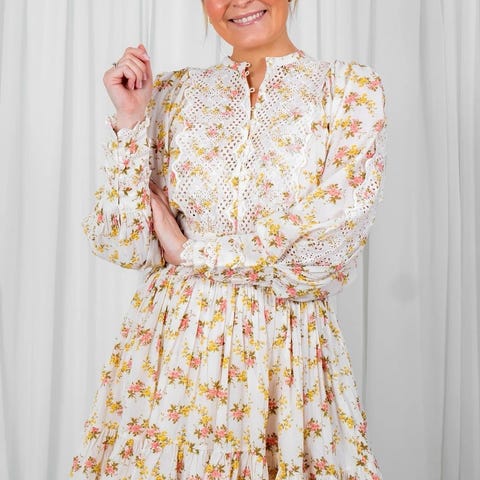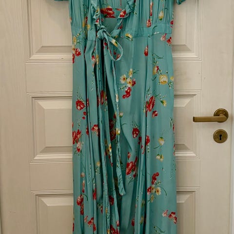 byTiMo sommerkjole for dame i størrelse S. Kjolen er rosa og laget i viskose. Modellen er ankellang med halvlange puffede ermer og rund hals. Lengde fra skulder ca 142 cm
