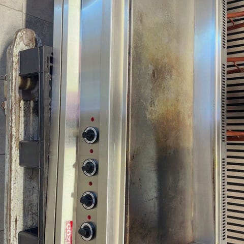 Gico elektrisk stekeplate i rustfritt stål. Enheten har glatt stekeflate med oppkant på sidene og bak for å redusere søl. Fronten har mekanisk termostat for temperaturregulering. Leveres med kraftig industrikontakt (rød CEE-plugg) for tilkobling til passende strømuttak. Egnet for profesjonelt kjøkken, kantine eller lignende bruk der det er behov for jevn og stabil stekeflate til ulike typer mat.