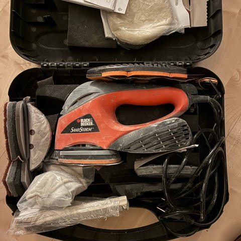 Black & Decker BS 720 båndsliper i rød farge. Elektrisk båndslipemaskin med strømkabel, egnet til sliping og grovbearbeiding av treverk og andre egnede materialer. Har håndtak for tohåndsgrep og integrert tilkobling for støvpose eller støvsuger (pose følger ikke nødvendigvis med). Passer til bruk i garasje, verksted eller ved oppussing der det er behov for jevn og effektiv sliping av flater. Spesifikke tekniske data som effekt (W) og båndstørrelse er ikke oppgitt og må eventuelt sjekkes mot produsentens informasjon for denne modellen.