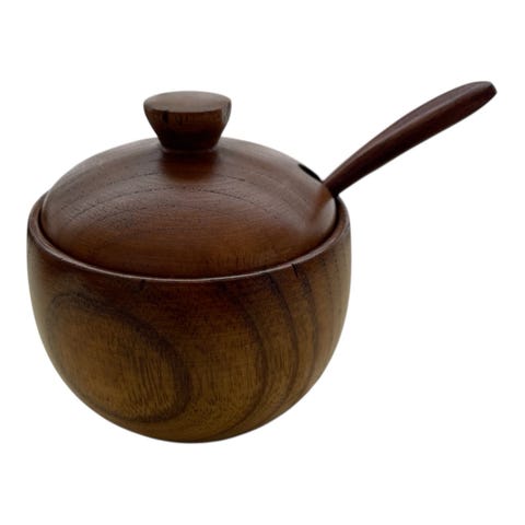 Vintage krydderhylle i tre med 5 porselenskrukker