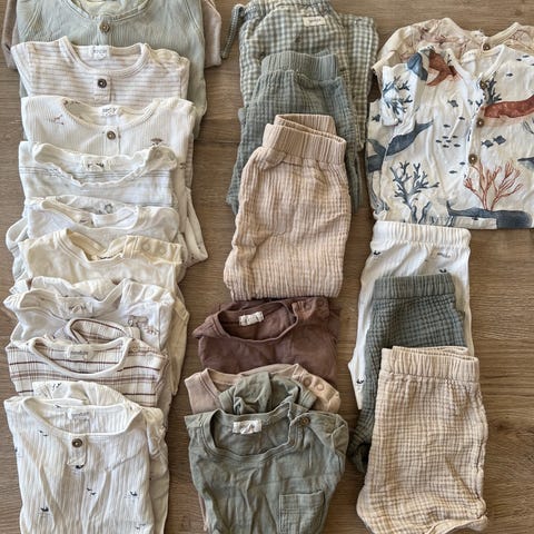 Stor klespakke i nøytrale farger❤️ De fleste plaggene er fra Newbie, noe Name it, hm og wheat. En av bodyene har litt misfarging ved halsen, resten er i veldig god stand😊