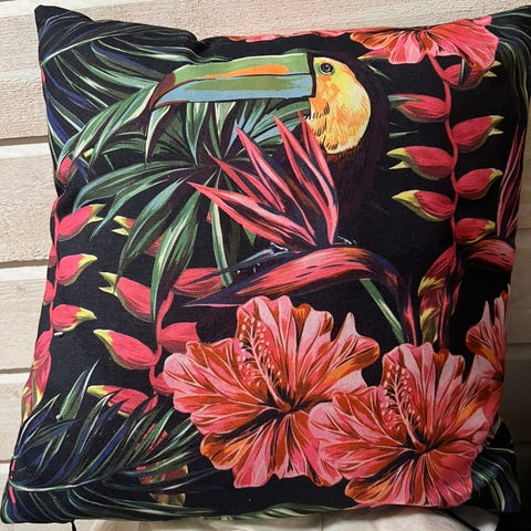 IKEA oppbevaringsboks i tekstil med tropisk mønster i front og ensfarget svart bakside. Motivene inkluderer flamingoer og blomster mot mørk bakgrunn. Boksen har hank på baksiden for enkel uttrekking fra hylle eller reol. Egnet til oppbevaring av klær, leker eller diverse småting i åpne hyllesystemer.30*30*30