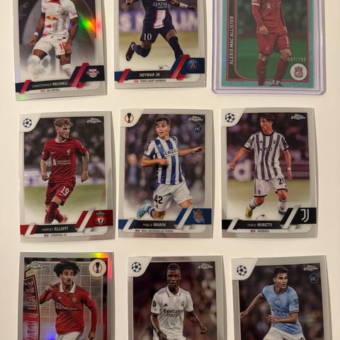 Kortene er pakket i plast i flere bunker, som på bildene. Egner seg for samlere av moderne fotballkort og UEFA-relaterte kortserier fra Topps.