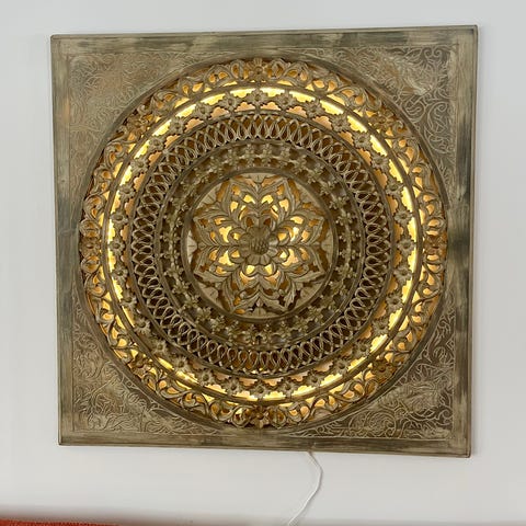 Veggdekor i form av et dekorativt veggpanel i tre. Panelet har utskåret, ornamentalt mønster som gir et detaljert uttrykk på veggen. Passer som veggpynt i stue, gang eller soverom, og kan kombineres med ulike interiørstiler. Materialet fremstår som et solid, hardt materiale egnet for innendørs bruk.