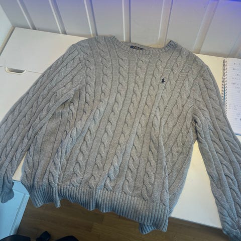 Ralph Lauren Polo ullgenser for herre i størrelse M. Genseren er grå og strikket i ull med flettestruktur. Den har rund hals med ribbestrikket kant, samt ribbestrikkede mansjetter og nederkant. Klassisk Polo-logo er brodert på brystet. Passer som hverdagsgenser eller til mer formelle anledninger i kjøligere vær.