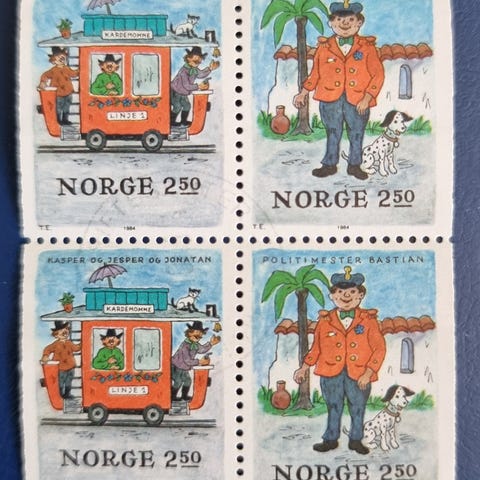 Lot med brukte norske frimerker med Dyreparken/ Torbjørn Egner motiv. Motivene inkluderer blant Politimester Bastian, røverne og Karius og Baktus. Pålydende verdier a 2,00 og 2,50 kroner. Frimerkene har stempel og er beregnet for samling.