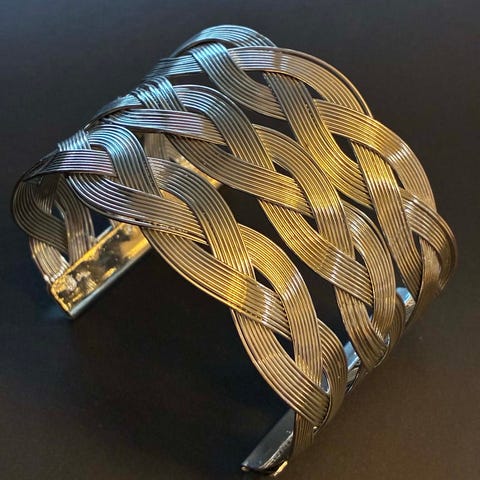 Armbåndet med åpent design, og med rund, stor plate på oversiden samt kuler i endene av bøylen.